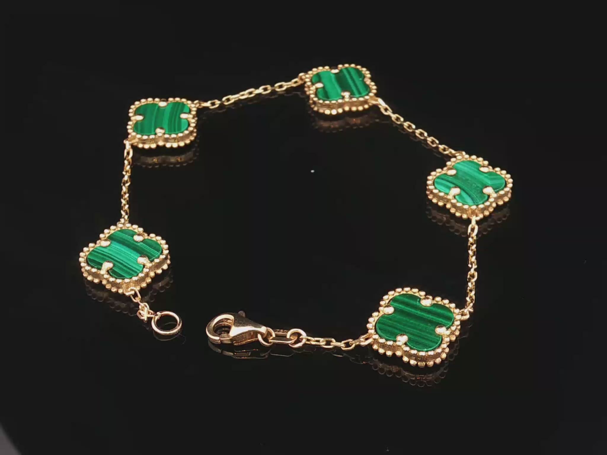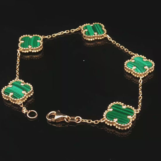 Pulsera de eslabones en oro amarillo, adornada con delicados cabujones cuadrados de malaquita. La malaquita, con su intenso color verde y patrones únicos, ofrece un atractivo visual llamativo. Esta pulsera combina la calidez del oro con la belleza natural de la malaquita, creando una pieza elegante y sofisticada.