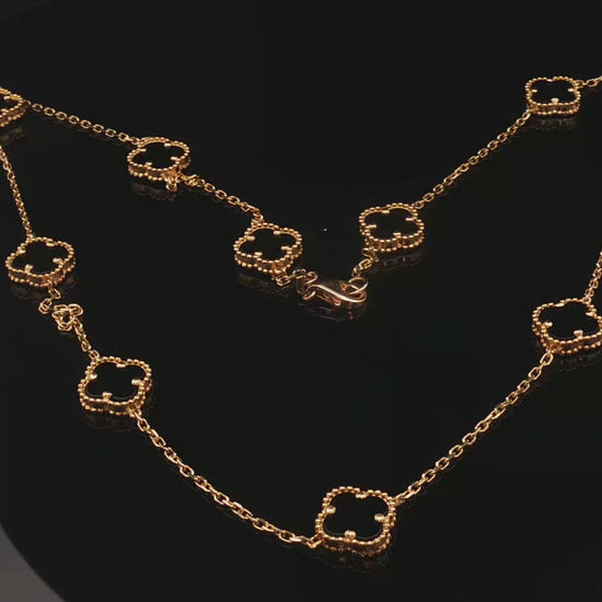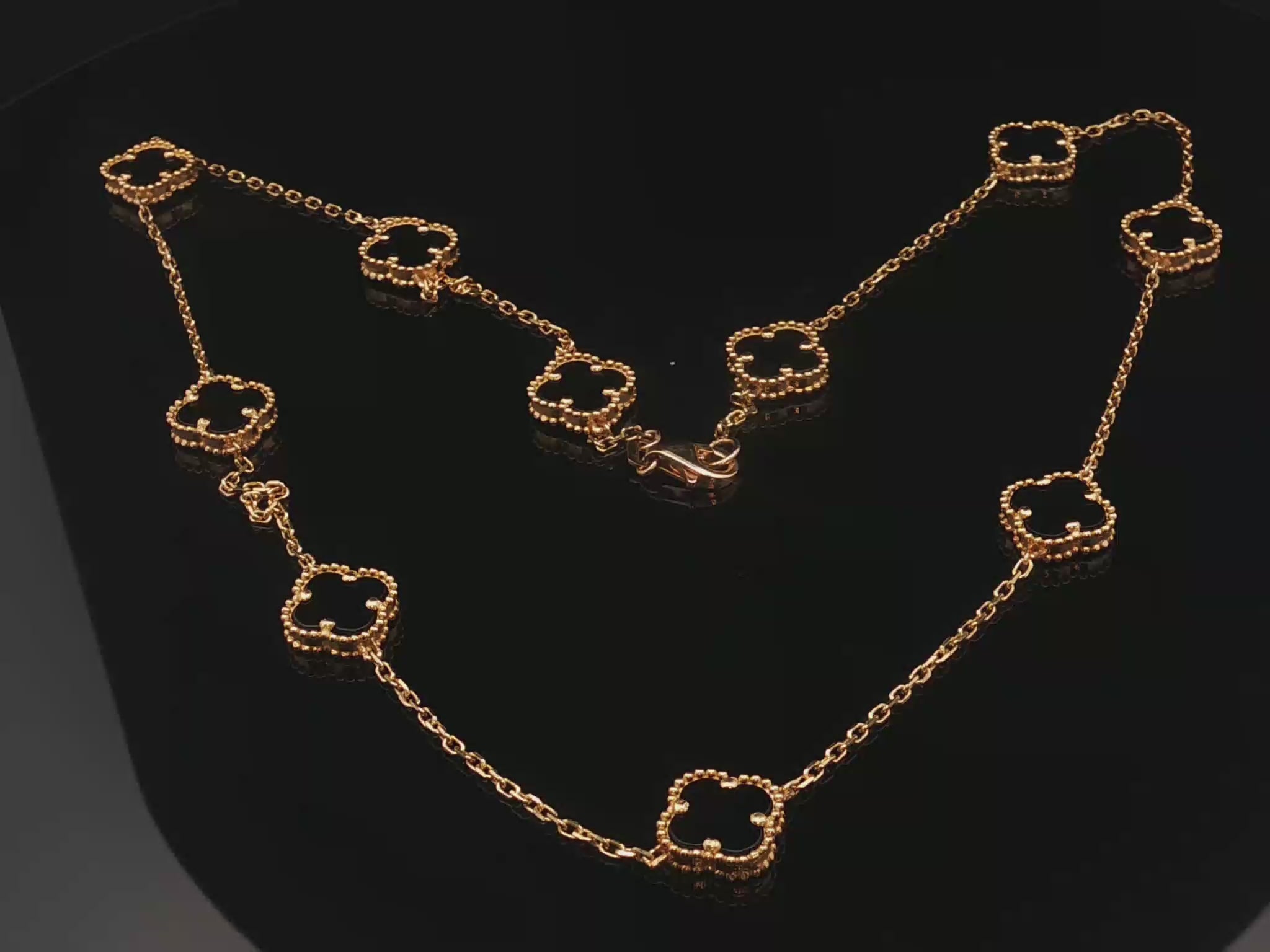 Cautivador collar de oro con motivos de trébol en ónix cabujón. Cada trébol, meticulosamente pulido, exhibe un brillo profundo y elegante. La cadena de oro complementa a la perfección el ónix, creando una pieza de joyería sofisticada y atemporal, ideal para añadir un toque de distinción a cualquier atuendo.